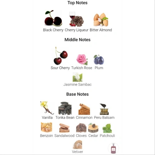 قلب نشان می دهد ترش ترش، آلو، رز ترکی، و یاسمین Sambac، در حالی که پایه ویژگی های وانیل، تونکا لوبیا، دارچین، پرو Balsam، بنزوئین، چوب صندل، گلدان، سدر، پچولی و ویتور است.