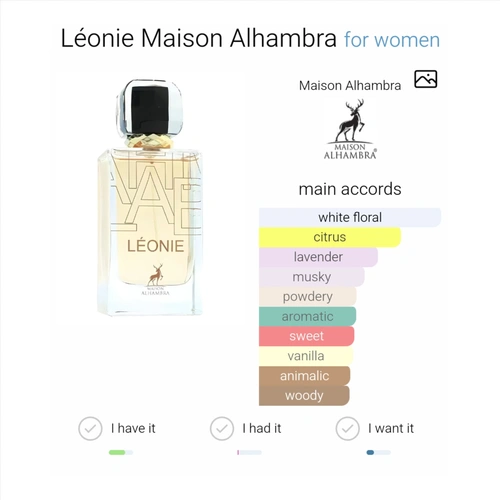 عطر زنانه Léonie از برند Maison Alhambra با رایحه گلی، در سال 2022 به بازار عرضه شد. الهامگرفته از آزادی، جسارت و قدرت درونی زنانه