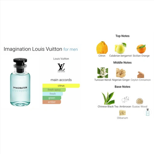 هرم بویایی ادکلن لویی ویتون ایمجینیشن آغازگر این عطر فرانسوی ، روایح بالنگ, پرتقال و برگاموت در نت نخستین میباشد. پس از گذشت اندک زمانی، نت میانی با رایحههای گیاه دارچین, زنجبیل, و بهار نارنج، جای نت اولیه را میگیرد و فضا را پر میکند. در نهایت، صمغ کندر, امبروکسان, چوب گایاک و چای در نت پایه، پایان عطر ایمجینیشن را رقم میزند.