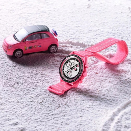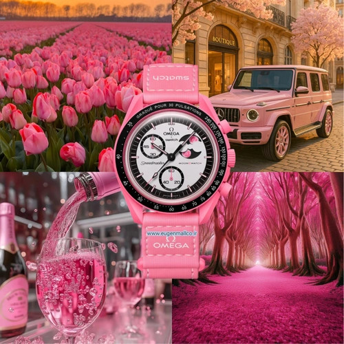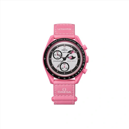این مدل از سری محبوب MoonSwatch نتیجه همکاری برندهای معتبر OMEGA و Swatch بوده و با رنگ صورتی جذاب و طراحی فاز ماه، جلوهای خاص و رمانتیک به استایل شما میبخشد.