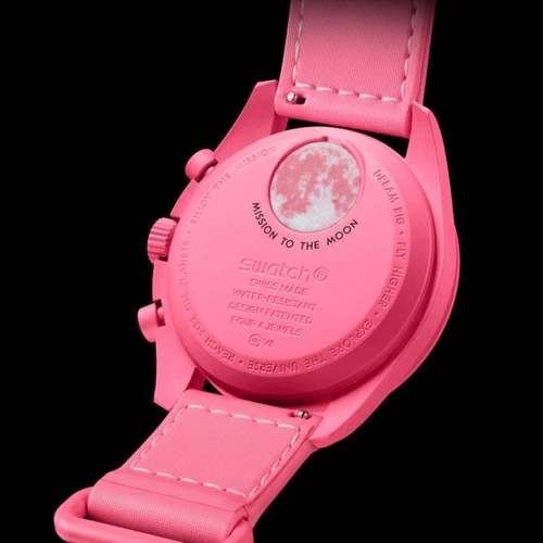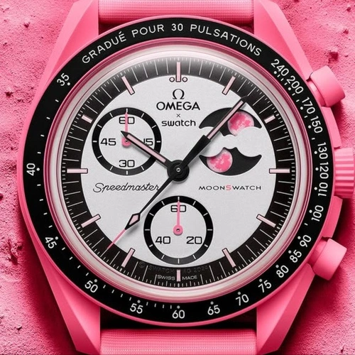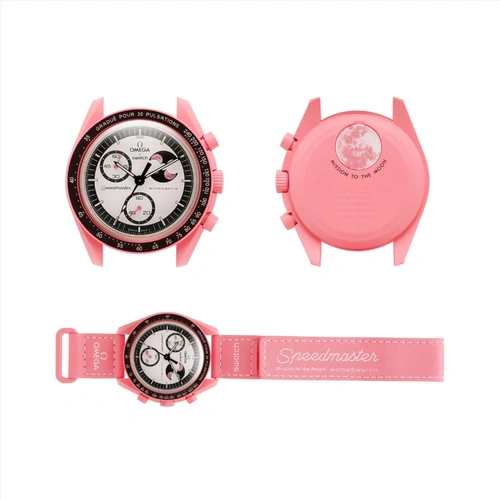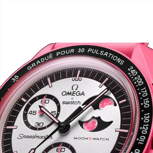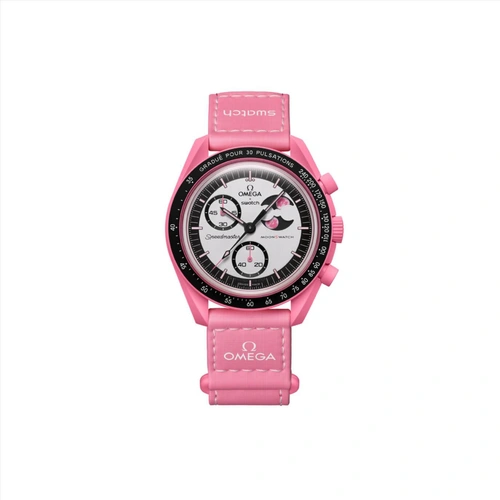 این مدل از سری محبوب MoonSwatch نتیجه همکاری برندهای معتبر OMEGA و Swatch بوده و با رنگ صورتی جذاب و طراحی فاز ماه، جلوهای خاص و رمانتیک به استایل شما میبخشد.