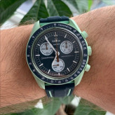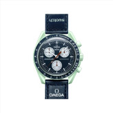 معرفی ساعت امگا سواچ مدل سفر به زمین omega swatch : تاریخچه برند امگا: در سال 2022 ساعت امگا سواچ با همکاری هم ساعت مچی جدیدی را طراحی کردند. تا نگاهی نوآورانه از ساعت افسانه ای Speedmaster Moonwatch داشته باشند و سری جدید ساعت امگا سواچ را بوجود آورند. ساعت های امگا سواچ 11رنگ طراحی شده است که هر رنگ مربوط به یک سیاره میباشد: 1رنگ خاکستری (سیاره عطارد)، 2رنگ صورتی ( سیاره نپتون)، 3رنگ زرد (سیاره خورشید)، 4رنگ سبز، سرمه ای (سیاره زمین)، 5رنگ قرمز (سیاره مریخ)، 6رنگ کالباسی (سیاره مشتری)، 7 رنگ نقره ای مشکی (سیاره ماه)، 8رنگ قهوه ای( سیاره زحل)، 9رنگ آبی روشن(سیاره اورانوس)، 10رنگ آبی (نپتون)، 11رنگ طوسی زرشکی (پلوتون). در مورد امگا سواچ مدل سفر به زمین فضانوردان اکو این ساعت سبز خاکی با بند آبی سرمه ای VELCRO© را دوست خواهند داشت. عقربه های ثانیه شمار و کرونوگراف به رنگ قهوه ای هستند. شماره های فرعی به رنگ سفید هستند. همانطور که مقیاس سرعت سنج در پس زمینه قاب آبی است. همه شمارهها دارای مارک OMEGA X SWATCH، و لوگوی جدید MoonSwatch هستند.