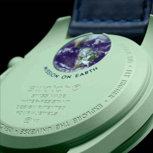 معرفی ساعت امگا سواچ مدل سفر به زمین omega swatch : تاریخچه برند امگا: در سال 2022 ساعت امگا سواچ با همکاری هم ساعت مچی جدیدی را طراحی کردند. تا نگاهی نوآورانه از ساعت افسانه ای Speedmaster Moonwatch داشته باشند و سری جدید ساعت امگا سواچ را بوجود آورند. ساعت های امگا سواچ 11رنگ طراحی شده است که هر رنگ مربوط به یک سیاره میباشد: 1رنگ خاکستری (سیاره عطارد)، 2رنگ صورتی ( سیاره نپتون)، 3رنگ زرد (سیاره خورشید)، 4رنگ سبز، سرمه ای (سیاره زمین)، 5رنگ قرمز (سیاره مریخ)، 6رنگ کالباسی (سیاره مشتری)، 7 رنگ نقره ای مشکی (سیاره ماه)، 8رنگ قهوه ای( سیاره زحل)، 9رنگ آبی روشن(سیاره اورانوس)، 10رنگ آبی (نپتون)، 11رنگ طوسی زرشکی (پلوتون). در مورد امگا سواچ مدل سفر به زمین فضانوردان اکو این ساعت سبز خاکی با بند آبی سرمه ای VELCRO© را دوست خواهند داشت. عقربه های ثانیه شمار و کرونوگراف به رنگ قهوه ای هستند. شماره های فرعی به رنگ سفید هستند. همانطور که مقیاس سرعت سنج در پس زمینه قاب آبی است. همه شمارهها دارای مارک OMEGA X SWATCH، و لوگوی جدید MoonSwatch هستند.