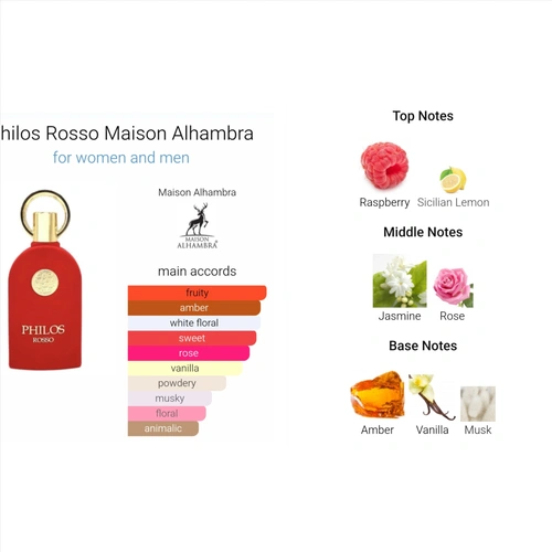 ادکلن زنانه فیلوس روسو الحمبرا مشابه سوسپیرو روسو افغانو – Sospiro Rosso Afgano Alhambra Philos Rosso سوسپیرو روسو افغانو، حکایت از شور و حرارت دارد. ادکلن شرقی گلی که در سال 2014 میلادی به بازار معرفی شد. این ادوپرفیوم زنانه مردانه، همچون شعلهای سرخ و افروخته، با رایحهای عمیق و پیچیده، دل هر شخصی را میرباید. بنابراین سوسپیرو روسو افغانو ترکیبی بینظیر از نتهای بالایی رز و زعفران و نتهای میانی نعناع هندی و سدر است که در نهایت به پایهای گرم و عمیق از مشک، وانیل و تنباکو ختم میشود.