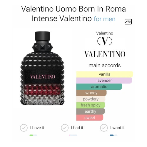 عطر والنتینو اومو بورن این روما اینتنس از برند والنتینو، عطری شرقی-وانیلی برای آقایان است. این عطر جدید است. عطر والنتینو اومو بورن این روما اینتنس در سال 2023 به بازار عرضه شد. علاوه بر این عطر والنتینو اومو بورن این روما اینتنس توسط آنتوان میسوندیو و گیوم فلاوینی خلق شده است.