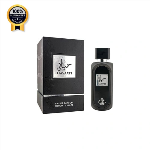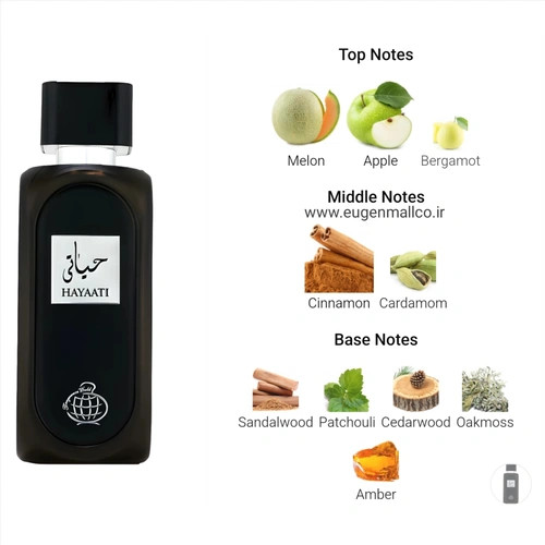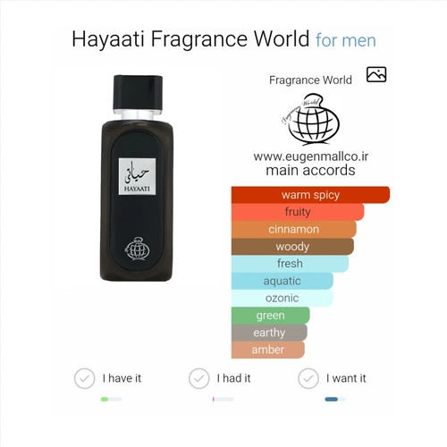 عطر Hayaati از برند Fragrance World، عطری با رایحه چوبی و آبی برای آقایان است. این عطر جدید است. Hayaati در سال 2024 به بازار عرضه شد. نتهای اولیه آن خربزه، سیب و ترنج؛ نتهای میانی آن دارچین و هل؛ و نتهای پایه آن چوب صندل، نعناع هندی، چوب سدر، خزه بلوط و کهربا هستند.